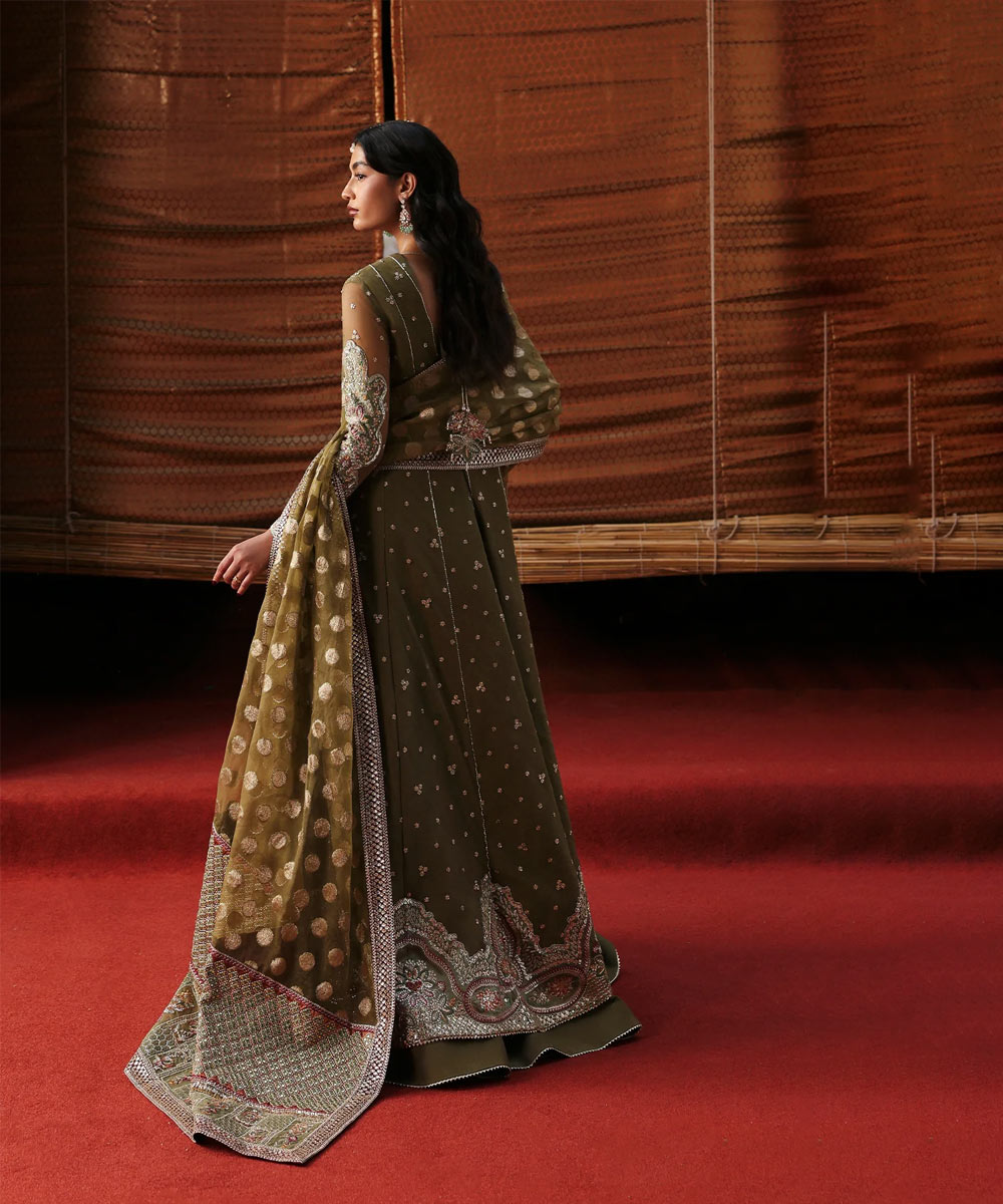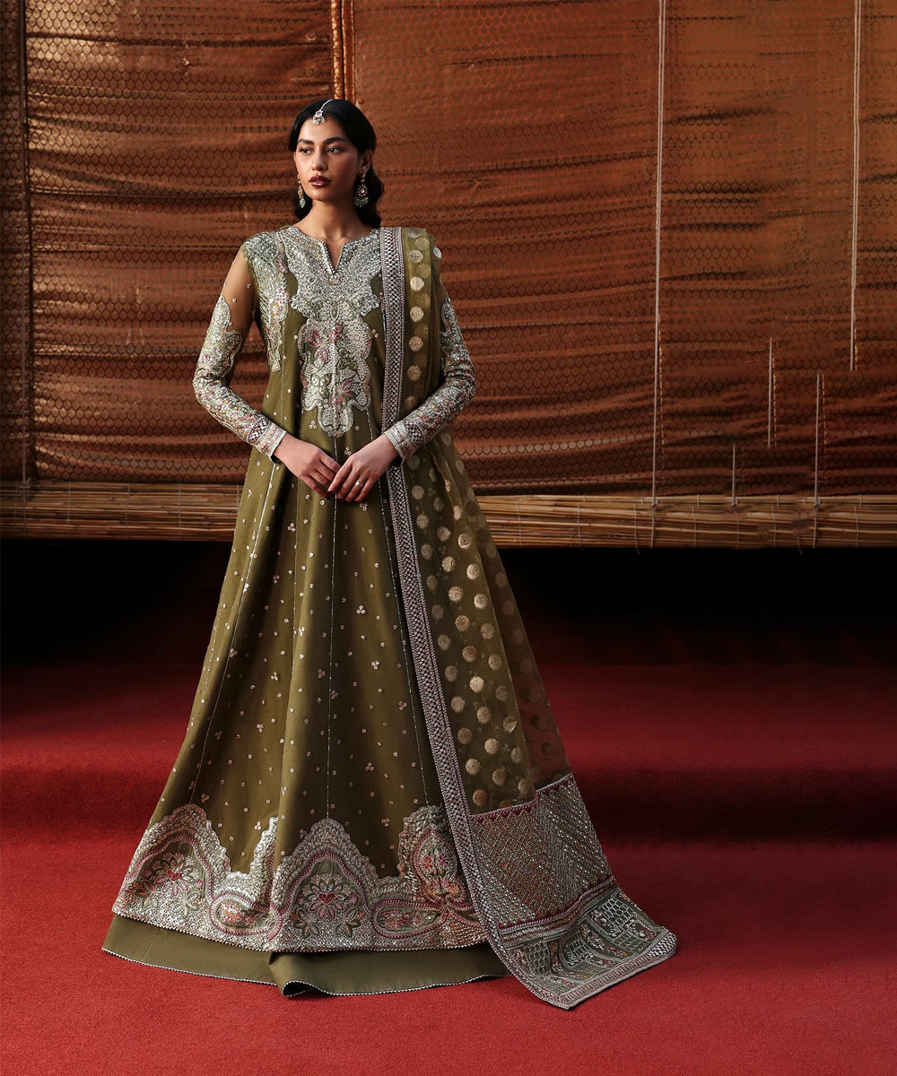 - light olive green raw silk embroidered sleeves border a 0.98 m
