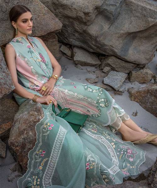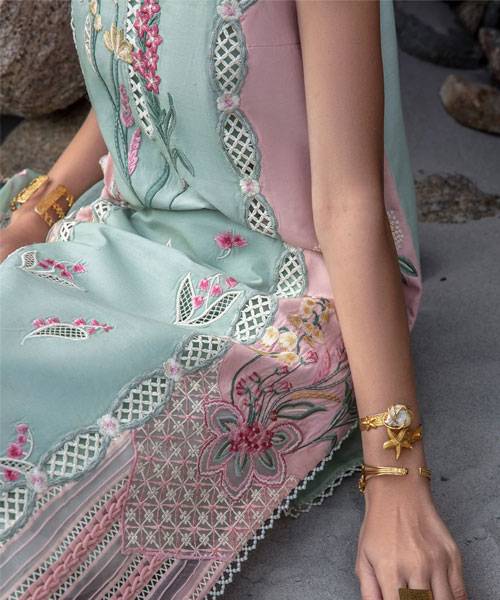 - One embroidered center panel with appliqued lace motifs and ghaara embroidery